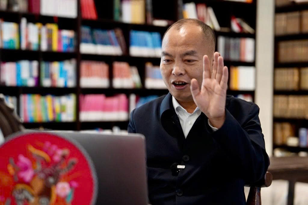 | Trưởng thôn Thập Bát Động Thi Kim Thông chat trực tuyến với trưởng bản Thinsoum Phatid. (Ảnh: Tân Hoa xã) |