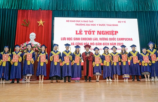 | Ban Giám hiệu trường Đại học Y Dược Thái Bình trao bằng tốt nghiệp cho các lưu học sinh Lào năm 2022. (Ảnh: tbump.edu.vn) |