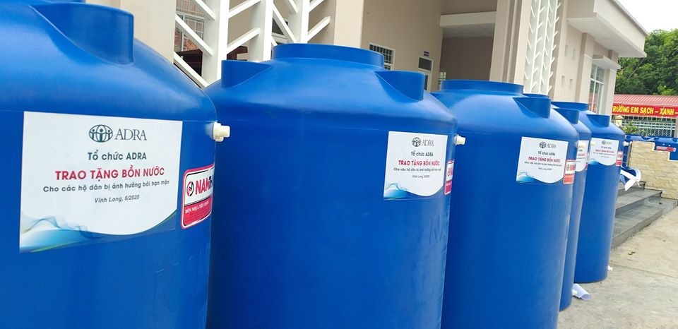 Tổ chức ADRA Việt Nam sẽ phân phối bể chứa nước cho 200 hộ nghèo tại huyện Trà Ôn, tỉnh Vĩnh Long. Bể chứa nước sẽ giúp gia đình tích trữ đủ lượng nước để dùng trong một vài tuần.