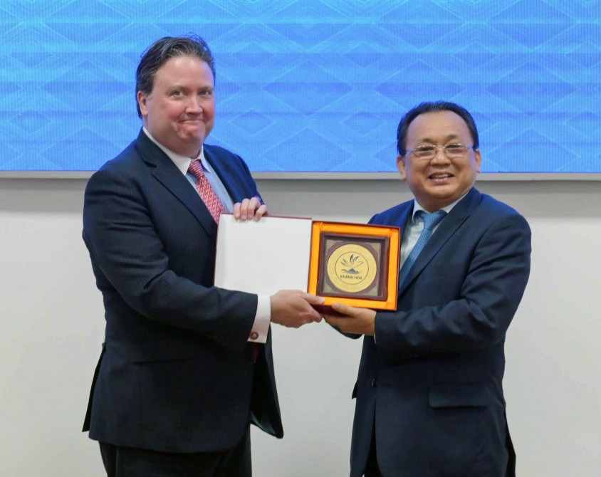 | Đại sứ Hoa Kỳ tại Việt Nam Marc Knapper khẳng định chuyến thăm của hai tàu sẽ góp phần duy trì quan hệ hữu nghị, đối tác chiến lược toàn diện giữa Việt Nam và Hoa Kỳ. Ông cho biết sẽ tiếp tục tìm những phương thức khác nhau nhằm tăng cường hiệu quả quan hệ hợp tác giữa Khánh Hòa với hai thành phố San Diego và Boston; hỗ trợ Khánh Hòa thu hút, tìm kiếm nhà đầu tư vào lĩnh vực công nghiệp công nghệ cao và phát triển hợp tác trong lĩnh vực du lịch. Trong ảnh, Phó Chủ tịch Thường trực UBND tỉnh Khánh Hòa Lê Hữu Hoàng (bên phải) tặng quà lưu niệm Đại sứ Hoa Kỳ tại Việt Nam Marc Knapper.(Ảnh: Báo Khánh Hòa) |