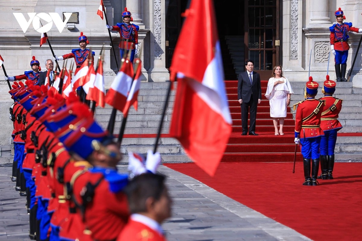 Ngày 13/11 (theo giờ địa phương), tại Phủ Tổng thống Casa de Pizarro ở thủ đô Lima, Tổng thống Peru Dina Ercilia Boluarte Zegarra đã chủ trì lễ đón trọng thể Chủ tịch nước Lương Cường cùng đoàn đại biểu cấp cao Việt Nam thăm chính thức Cộng hòa Peru.
