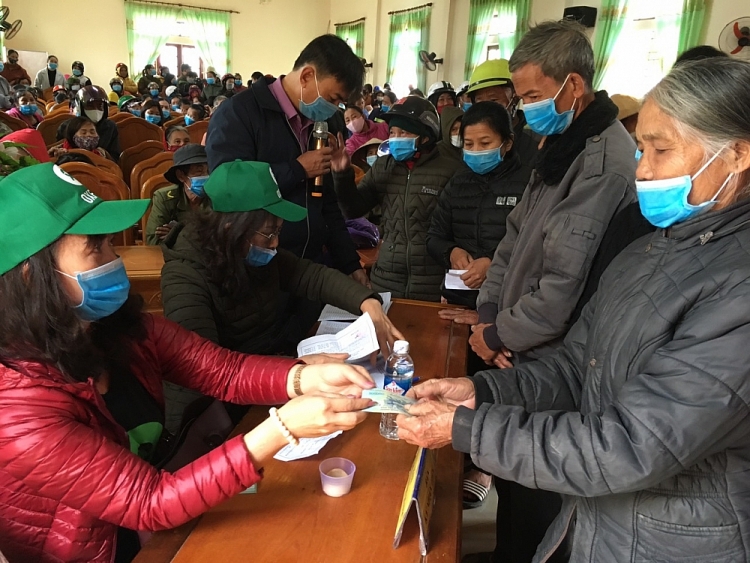 | Người dân tại 2 huyện Cẩm Xuyên và Thạch Hà, Hà Tĩnh nhận cứu trợ. |