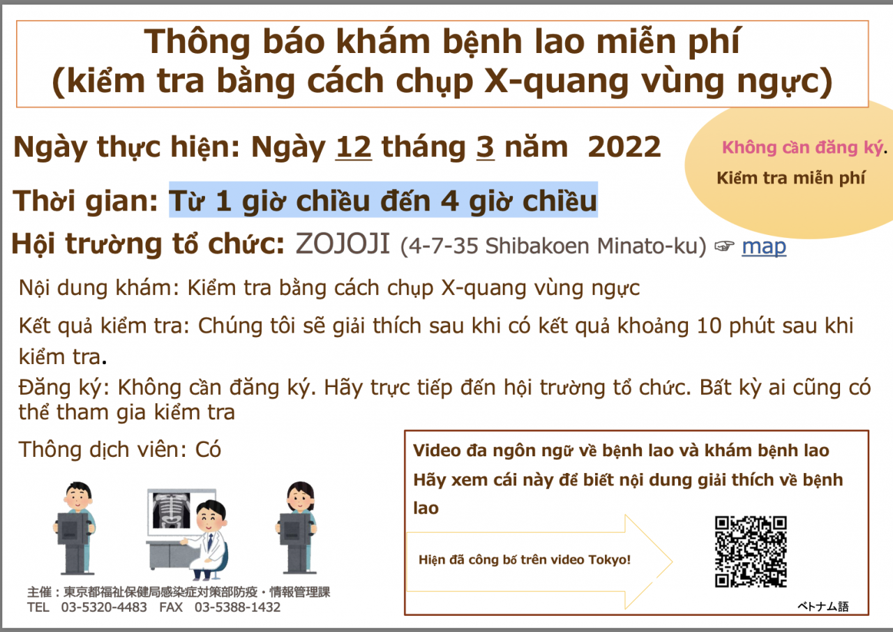 Trong trường hợp phát hiện sớm, bệnh nhân lao không lây cho người khác sẽ được phép điều trị tại nhà mà không cần phải nhập viện. Cách tốt nhất để phát hiện sớm bệnh lao là chụp X-quang phổi. Nếu bị chẩn đoán nhiễm lao, người bệnh sẽ được hệ thống y tế công hỗ trợ phần lớn chi phí điều trị như đối với COVID-19, kể cả khi đã hết hạn BHYT tại Nhật.