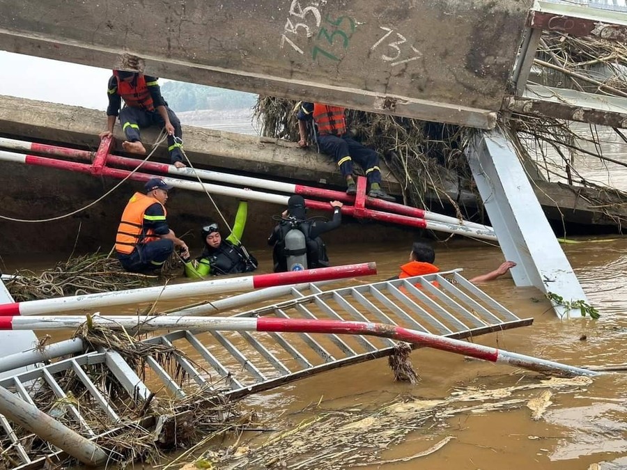 | Trước đó, khoảng 10h ngày 9/9, cầu Phong Châu (ở huyện Tam Nông, tỉnh Phú Thọ) sập 2 mố cầu rơi xuống lòng sông Hồng. Theo báo cáo của UBND tỉnh Phú Thọ, thiệt hại vụ sập cầu có 1 ô tô tải, 2 ô tô đầu kéo, 6 mô tô, 1 xe máy điện và 8 người mất tích. |