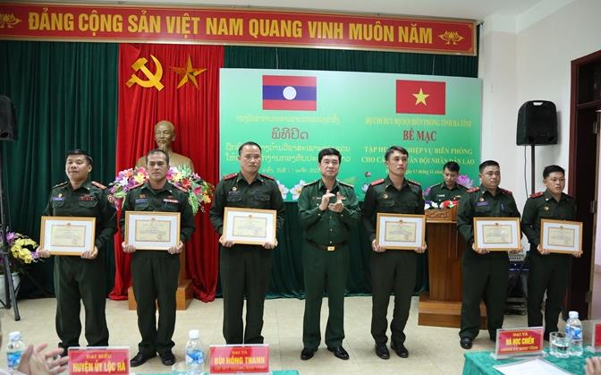 Đại tá Bùi Hồng Thanh, Chỉ huy trưởng BĐBP Hà Tĩnh trao tặng giấy khen cho 6 cán bộ Bộ Chỉ huy Quân sự tỉnh Bôlykhămxay có thành tích xuất sắc trong tập huấn.