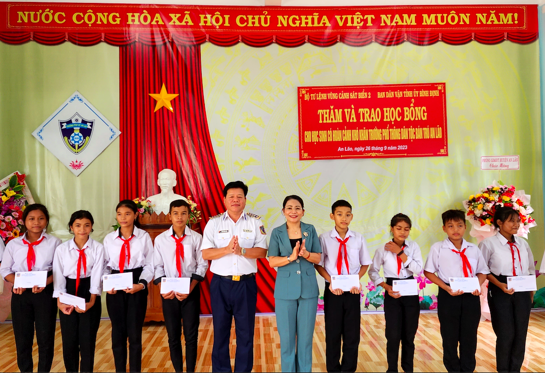 Đoàn công tác cũng đến thăm và tặng quà Trường Phổ thông dân tộc bán trú An Lão; tặng tivi cho thư viện nhà trường và 20 suất học bổng (1 triệu đồng /suất) cho học sinh con em đồng bào dân tộc thiểu số vượt khó học giỏi.