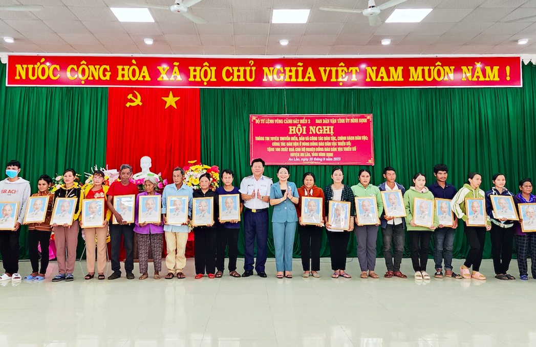 | Đại tá Trần Quang Tuấn - Tư lệnh Vùng Cảnh sát biển 2 và bà Nguyễn Thị Phong Vũ - Trưởng ban Dân vận Tỉnh ủy Bình Định tặng quà, ảnh Bác Hồ cho đồng bào dân tộc thiểu số có hoàn cảnh khó khăn ở An Lão. Ảnh: Báo Quảng Nam. |