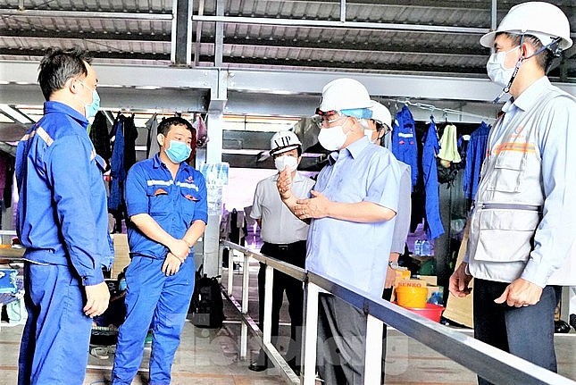 | Lãnh đạo tỉnh Bình Dương thăm hỏi, động viên người lao động đang tham gia sản xuất tại nhà máy (Ảnh: TPO) |