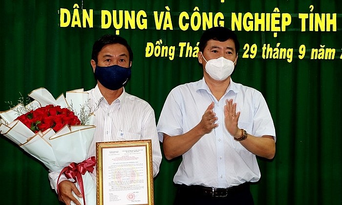 | Ông Lê Minh Tâm (giữa) nhận quyết định (Ảnh: Cổng TTĐT tỉnh Đồng Tháp) |