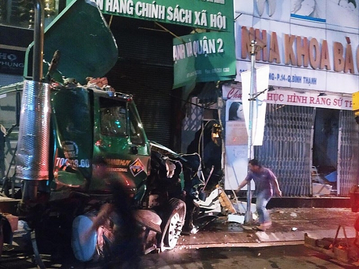Theo đó, khi đến gần Ngân hàng Chính sách xã hội trên đường Bạch Đằng, phường 14, quận Bình Thạnh thì tài xế xe container không làm chủ được tai lái, chiếc xe lao thẳng vào ngân hàng và chỉ dừng lại sau khi tông sập tường nhà dân gần đó.