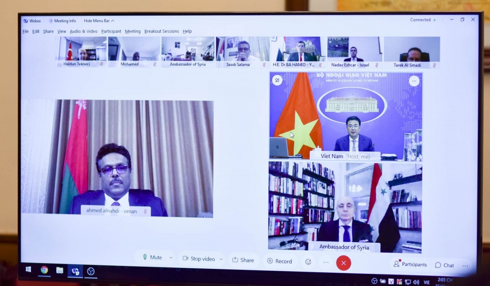 | Thứ trưởng Phạm Quang Hiệu tại buổi họp trực tuyến với các Đại sứ và Đại biện các quốc gia Trung Đông. |