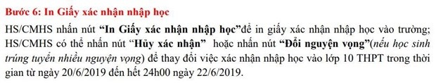 Ở thao tác này, học sinh, cha mẹ học sinh có thể nhấn nút "Hủy xác nhận" hoặc nút "Đổi nguyện vọng" (nếu học sinh trúng tuyển nhiều nguyện vọng) để thay đổi việc xác nhận thủ tục nhập học vào lớp 10.