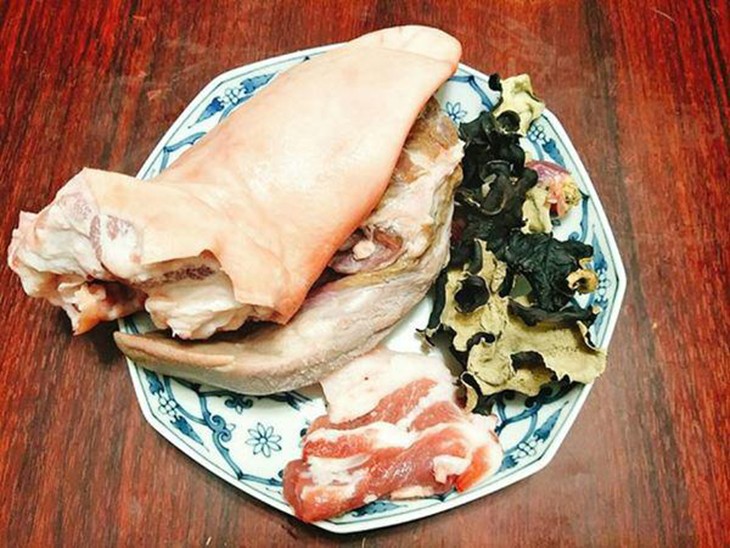 Tai heo, mũi heo làm sạch lông, thịt giò heo rửa sạch với nước nhiều lần rồi để ráo. Lưỡi heo cũng đem rửa sạch, chần qua nước sôi có pha thêm rượu trắng để cạo bỏ phần màng trắng trên bề mặt lưỡi. Sau đó vớt ra rửa lại một lần nữa và để ráo.
