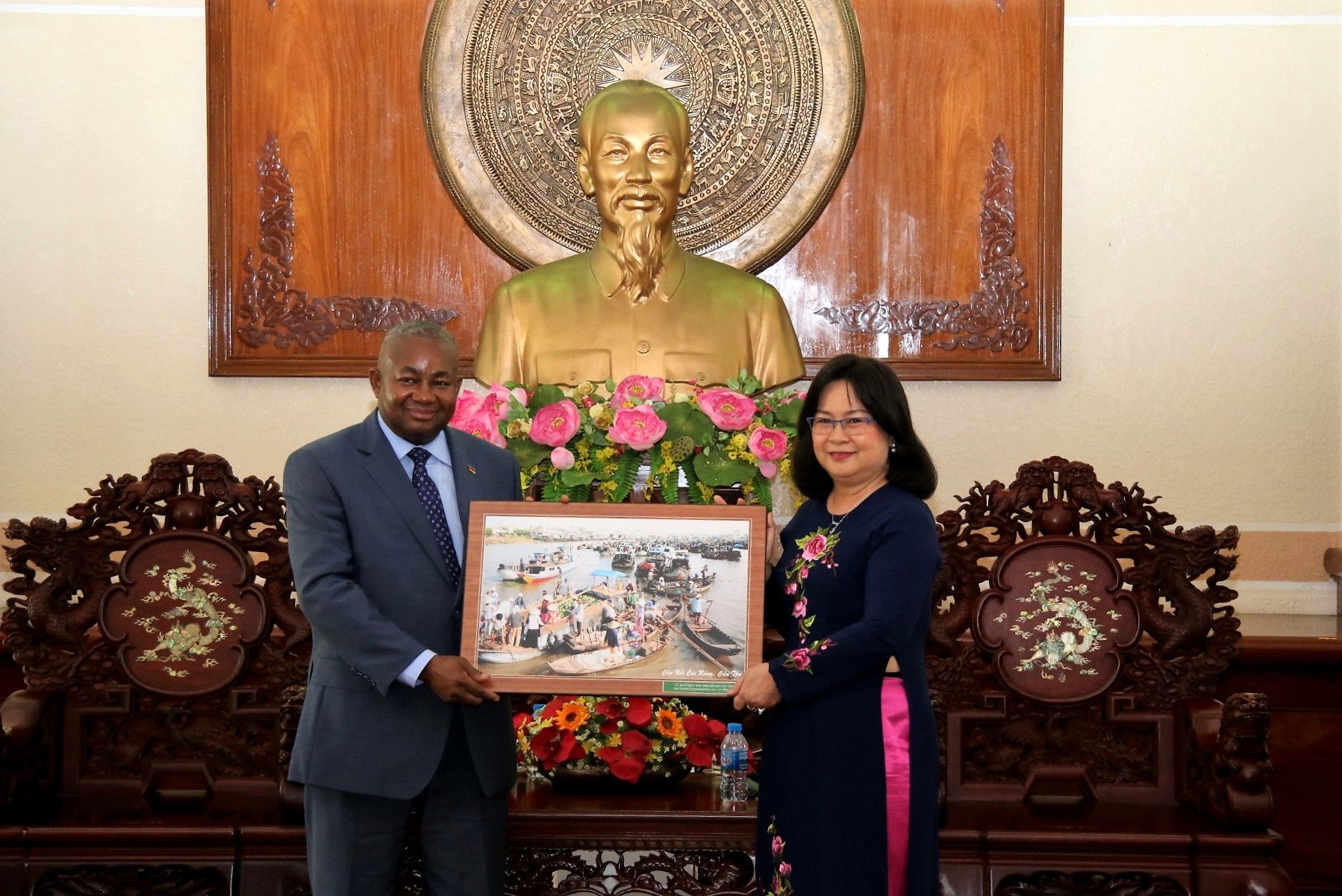 Phó Chủ tịch UBND TP.Cần Thơ - Võ Thị Hồng Ánh trao tặng quà lưu niệm cho ngài Đại sứ Cộng hòa Mozambique tại Việt Nam.