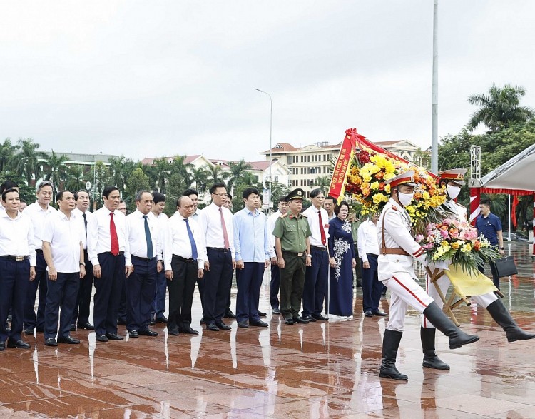 Tiếp đó, Chủ tịch nước Nguyễn Xuân Phúc và Đoàn công tác dâng hoa tại Tượng đài Tổng Bí thư Nguyễn Văn Linh, người con ưu tú của quê hương Hưng Yên, người học trò xuất sắc của Chủ tịch Hồ Chí Minh, đã cống hiến trọn đời cho sự nghiệp cách mạng Việt Nam.