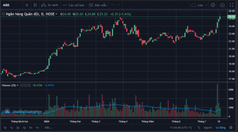 Chốt phiên giao dịch sáng, cổ phiếu MBB đứng ở mức 25.200 đồng/cổ phiếu, tăng 1,2%, với khối lượng giao dịch lên tới hơn 21,2 triệu đơn vị. Đây cũng là phiên tăng giá thứ 5 liên tiếp của cổ phiếu MBB