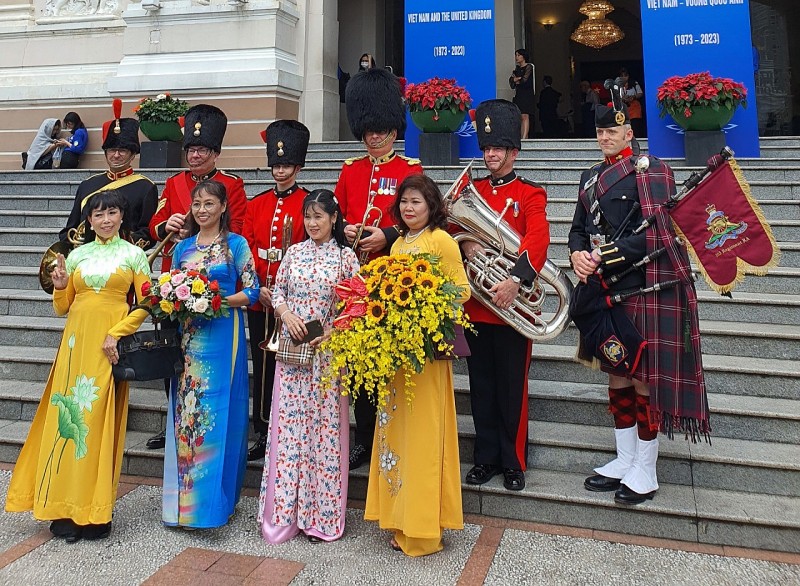 | Kiều bào chụp ảnh lưu niệm với Ban nhạc Quân đội Hoàng gia Vương quốc Anh tại Lễ Kỷ niệm |
