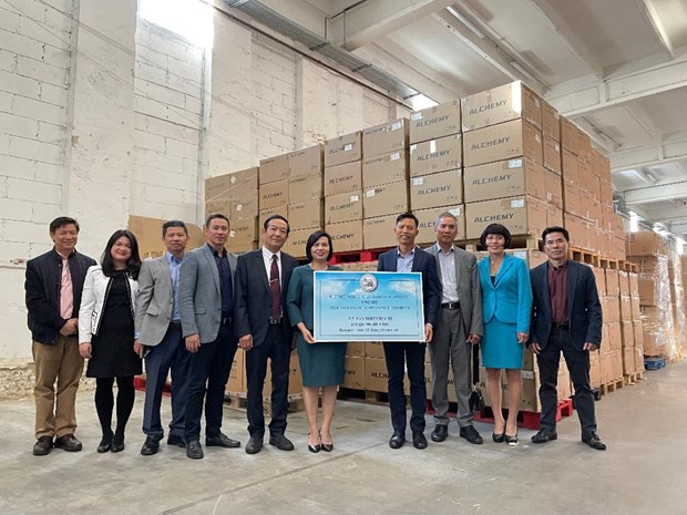 | Hiệp hội Người Việt Nam tại Hungary bàn giao vật tư y tế chống COVID-19 cho Đại sứ quán Việt Nam tại Hungary, ở thủ đô Budapest ngày 22/9/2021. (Ảnh: Hoàng Linh/Vietnam+) |