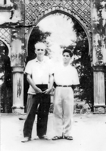 | Ông Nghiêm Hữu Phúc, từng là cán bộ phụ trách chăn nuôi của nông trường Việt Phi và một hàng binh châu Phi bên chiếc cổng Ma-rốc. Ảnh: Báo Nhân dân |
