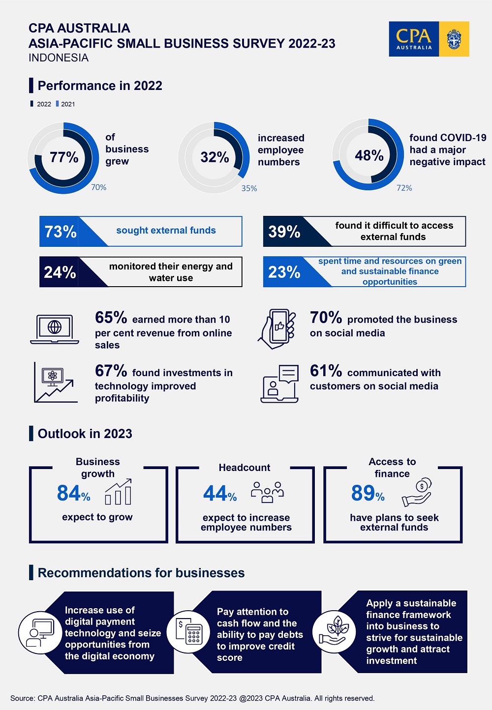Theo Khảo sát Doanh nghiệp nhỏ Châu Á-Thái Bình Dương của CPA Australia, các doanh nghiệp nhỏ của Indonesia vẫn là những doanh nghiệp vào loại tích cực nhất trên khắp châu Á-Thái Bình Dương trong năm 2022. Cuộc khảo sát bao gồm phản hồi từ 4.280 chủ sở hữu hoặc người quản lý doanh nghiệp nhỏ tại 11 thị trường châu Á-Thái Bình Dương, trong đó có 306 đến từ Indonesia. Có tới 77% người được hỏi nhận định tăng trưởng trong năm 2022 và 32% thuê thêm nhân viên. Năm nay dự kiến sẽ còn mạnh mẽ hơn với hơn 40% doanh nghiệp nhỏ dự định thuê thêm nhân viên.