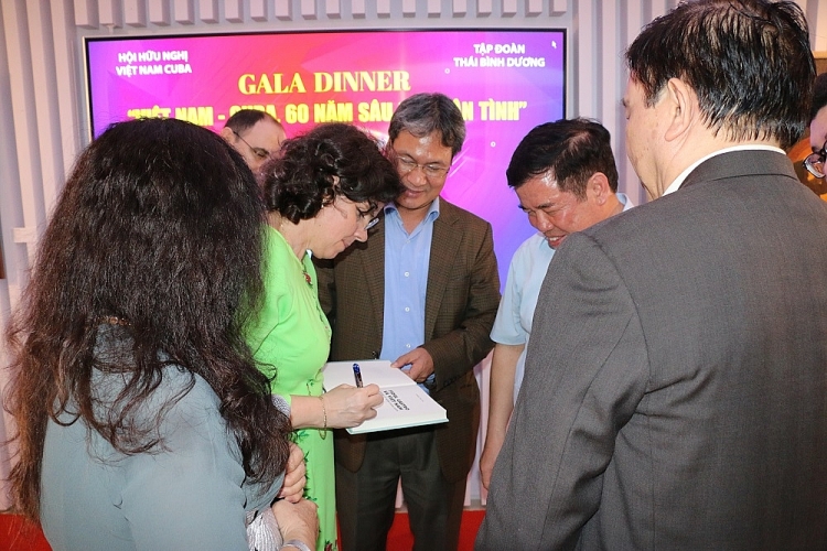 | Đại sứ Lianys Torres Rivera ký sách "Việt Nam - Cuba - Những kỷ niệm không quên" tặng các đại biểu tham dự gala. |