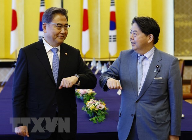 Ngoại trưởng Nhật Bản Yoshimasa Hayashi (phải) và người đồng cấp Hàn Quốc Park Jin tại cuộc gặp ở Tokyo ngày 18/7. (Ảnh: AFP/TTXVN)