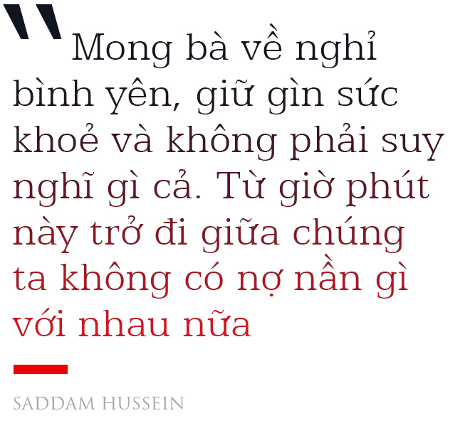 Nghe đến đây, Saddam nói ngay: "Mong bà về nghỉ bình yên, giữ gìn sức khoẻ và không phải suy nghĩ gì cả. Từ giờ phút này trở đi giữa chúng ta không có nợ nần gì với nhau nữa." Bà Bình một lần nữa lại không tin vào tai mình, quay sang tôi nói: "Khai, em hỏi lại xem có đúng Tổng thống Saddam Hussein nói như vậy không?"