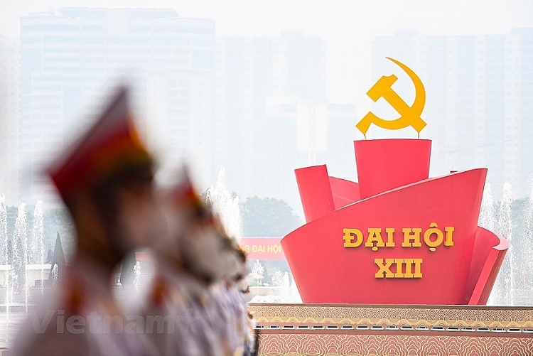 | Một biểu tượng lớn với dòng chữ Đại hội XIII được dựng lên phía trước Trung tâm Hội nghị Quốc gia. (Ảnh: PV/Vietnam+) |