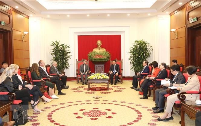 | Chủ tịch Hội đồng Lý luận Trung ương Nguyễn Xuân Thắng tiếp Đoàn đại biểu cấp cao Đảng Cánh tả Đức do ông Tobias Bank, Tổng Thư ký làm Trưởng Đoàn (Ảnh: Phương Hoa/TTXVN). |