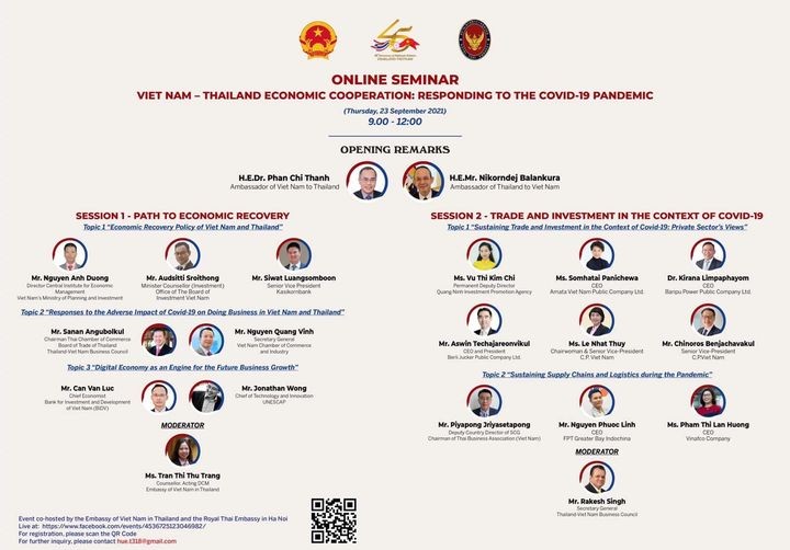 Ông Sanan Angubolkul, Chủ tịch Hội đồng Kinh doanh Thái-Việt và ông Nguyễn Quang Vinh, Tổng Thư ký Phòng Thương mại và Công nghiệp Việt Nam chia sẻ ý kiến cho rằng, không nên chờ dịch bệnh qua đi rồi mới đề ra các biện pháp phục hồi kinh tế mà cần có lộ trình rõ ràng và các biện pháp an toàn để sớm mở cửa trở lại đất nước, trong đó mấu chốt là đẩy nhanh việc tiêm vắc-xin và nâng cao năng lực của doanh nghiệp trong tự ứng phó với dịch bệnh.