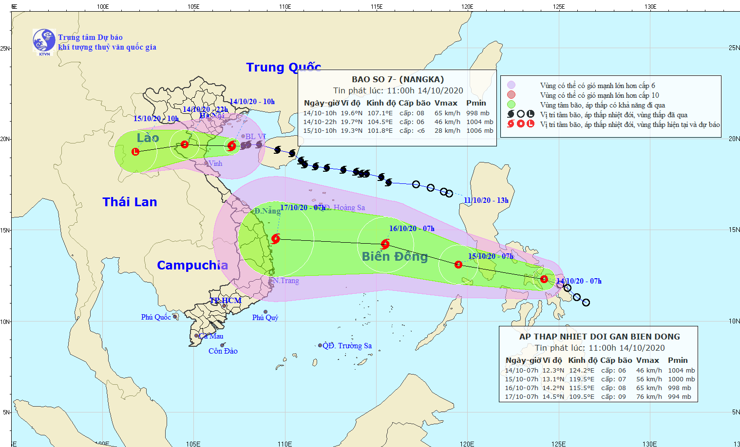Theo dự báo của Trung tâm khí tượng Thủy văn Trung ương, hồi 10 giờ hôm nay (14/10), vị trí tâm bão số 7 ở vào khoảng 19,6 độ Vĩ Bắc; 107,1 độ Kinh Đông, ngay trên vùng biển các tỉnh từ Thái Bình đến Nghệ An. Sức gió mạnh nhất vùng gần tâm bão mạnh cấp 8 (60-75km/giờ), giật cấp 10. Bán kính gió mạnh từ cấp 6, giật từ cấp 8 trở lên khoảng 150km tính từ tâm bão.