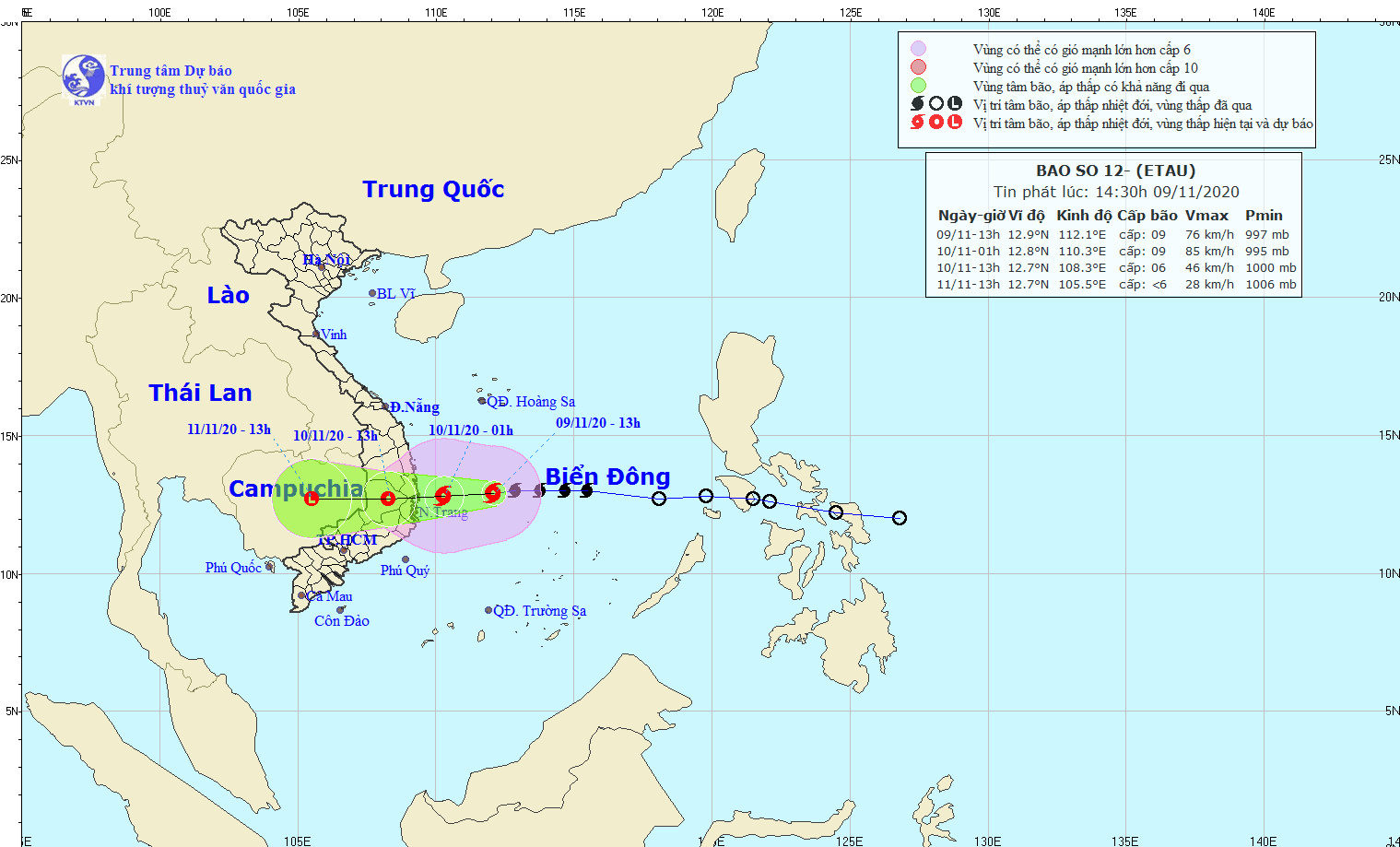 Theo ghi nhận của Trung tâm khí tượng thủy văn Trung ương, hồi 13 giờ hôm nay 13/11, vị trí tâm bão số 13 ở khoảng 15,5 độ Vĩ Bắc; 114,5 độ Kinh Đông, cách quần đảo Hoàng Sa khoảng 280km về phía Đông Đông Nam. Sức gió mạnh nhất vùng gần tâm bão mạnh cấp 11-12 (100-135km/giờ), giật cấp 15. Bán kính gió mạnh từ cấp 6, giật từ cấp 8 trở lên khoảng 220km tính từ tâm bão; bán kính gió mạnh từ cấp 10, giật từ cấp 12 trở lên khoảng 90km tính từ tâm bão.