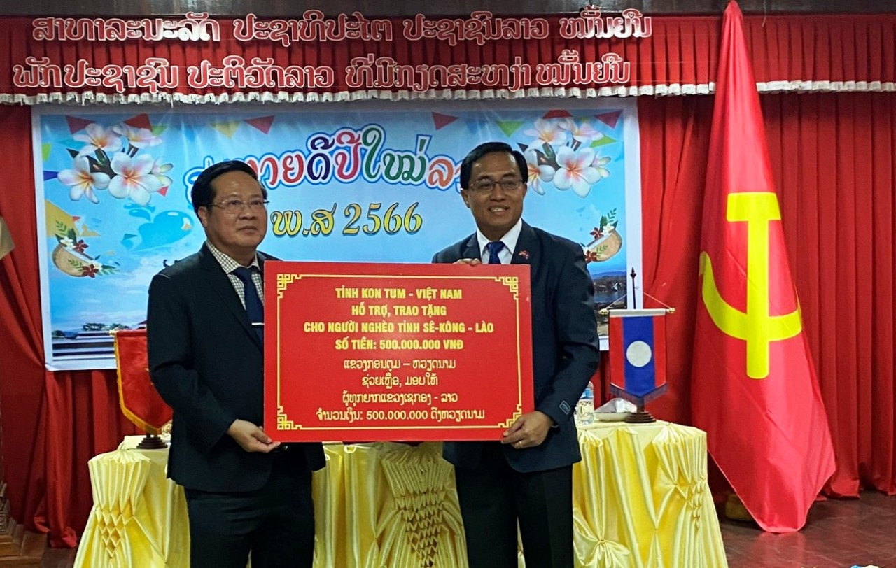 Nhân dịp này, thay mặt Đảng bộ, chính quyền và nhân dân tỉnh Kon Tum, Phó Bí thư Tỉnh ủy, Chủ tịch UBND tỉnh Kon Tum đã trao tặng tỉnh Salavan số tiền 400 triệu đồng để hỗ trợ, giúp đỡ người nghèo đón Tết.