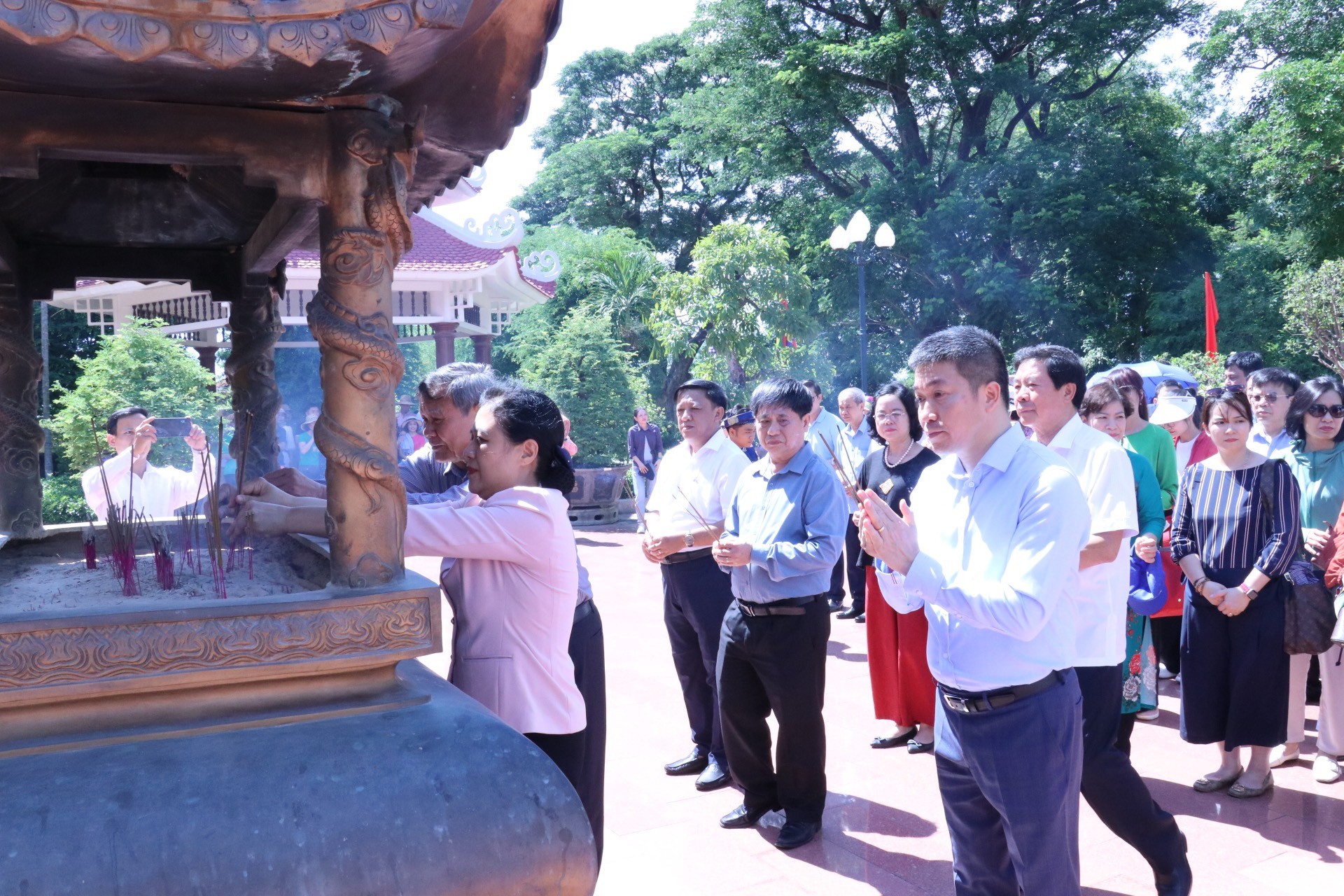 | Chủ tịch VUFO Nguyễn Phương Nga cùng các đại biểu dâng hương tại Đền thờ Tây Sơn Tam kiệt (Ảnh: Thu Hà). |