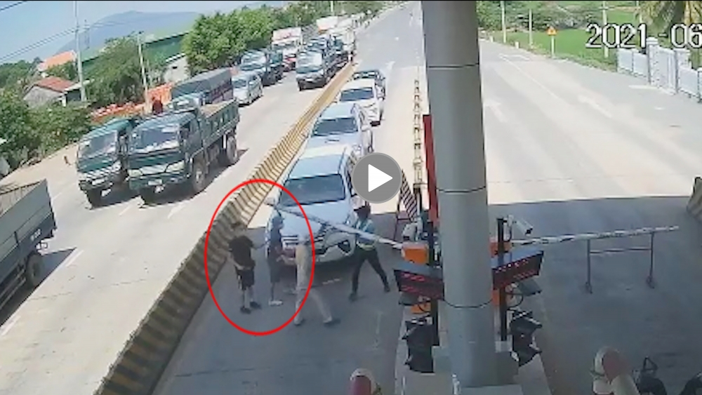 | Camera giao thông: Tài xế đã bị văng khỏi chiếc xe tải của mình sau khi đâm vào một trạm thu phí. |