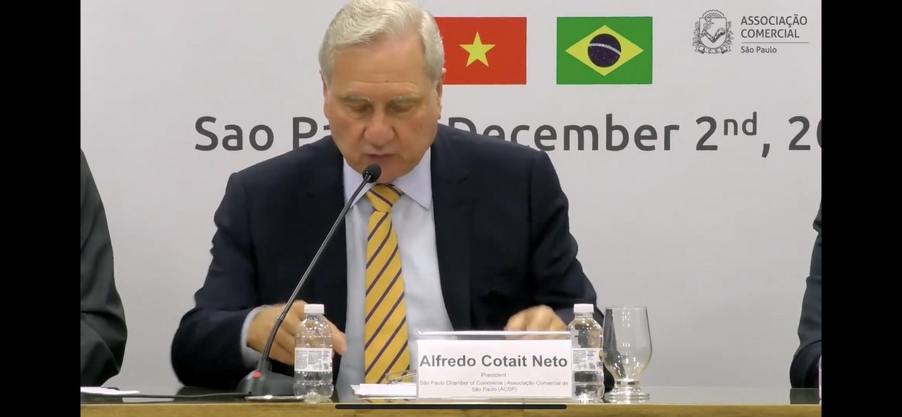 | Ông Alfredo Cotait Neto, Chủ tịch Phòng Thương mại, Chủ tịch Hiệp hội Thương mại Sao Paulo, Brazil phát biểu tại hội thảo. |