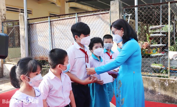 | Bà Bùi Thị Liễu, Phó Chủ tịch Liên hiệp Đồng Nai trao học bổng cho học sinh H.Long Thành. Ảnh: Báo Đồng Nai |