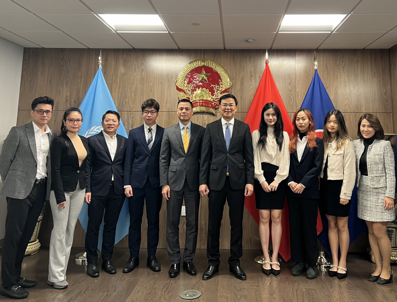 | Thứ trưởng Ngoại giao Phạm Quang Hiệu và Đoàn công tác làm việc với đại diện Hội Thanh niên, Sinh viên Việt Nam tại New York (Ảnh: Ủy ban Nhà nước về người Việt Nam ở nước ngoài). |