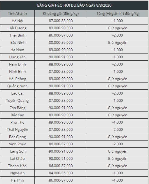 Giá heo hơi hôm nay 8/8 miền Bắc: Dự báo giảm mạnh trên diện rộng, giá heo chủ yếu dao động ở mức 90.000 - 91.000 đồng/kg. Tại Thái Bình, giá giảm 2.000 đồng xuống còn 86.000 đồng/kg. Mức giảm này cũng được dự báo cho thị trường Yên Bái, Lào Cai, còn 89.000 đồng/kg.
