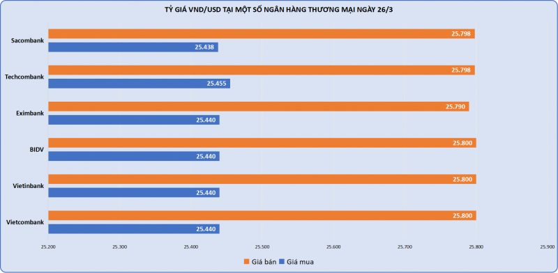 Trên thị trường liên ngân hàng, tỷ giá chốt phiên với mức 25.620 VND/USD, giảm 23 đồng so với phiên 24/3. Tỷ giá trên thị trường tự do tăng nhẹ 5 đồng ở cả hai chiều mua vào và bán ra, giao dịch tại 25.815 VND/USD và 25.905 VND/USD.