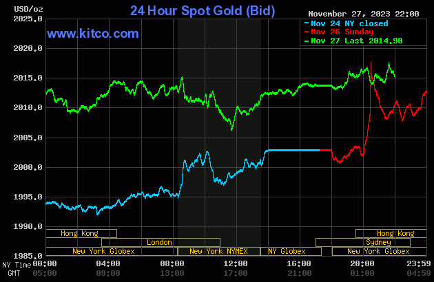 Giá vàng giao ngay trên Kitco hiện đang ở mức 2014,9 USD/ounce, tăng 25,6 USD, tương đương 1,29% so với chốt phiên trước.