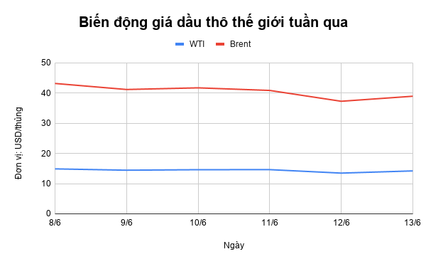 Sáng thứ Hai, 15/6, trong giao dịch dầu thô thế giới, giá dầu thô WTI giảm 0,21 USD/thùng tương ứng 1,49%, xuống mức 13,91 USD/thùng. Dầu Brent được giao ngay cũng theo chiều giảm 0,43 USD/thùng tương ứng 2,39%, xuống 38,62 USD/thùng.