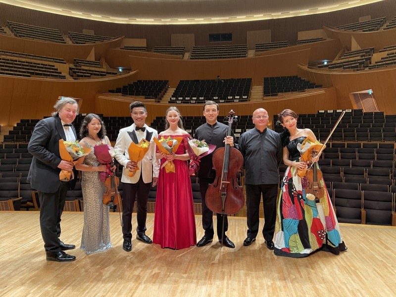 | Ca sĩ Nguyễn Khắc Hòa (thứ ba từ trái sang), ca sĩ Natalya Skryabina (thứ tư từ trái sang) và nghệ sĩ dương cầm Francisco Cipolletta (thứ sáu từ trái sang) (Ảnh: BTC). |
