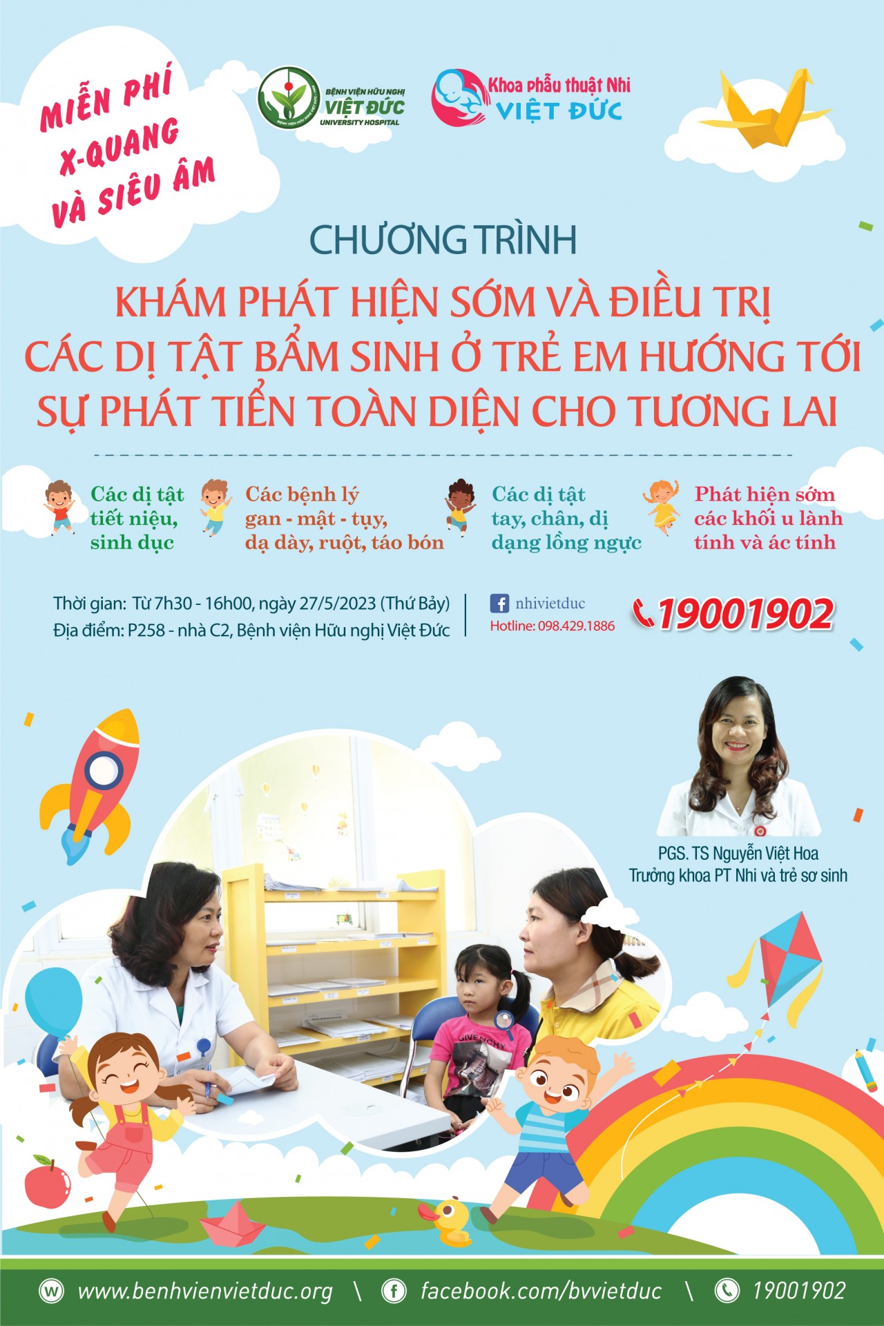 Ngày 27/5, Bệnh viện Hữu nghị Việt Đức sẽ tổ chức chương trình khám phát hiện sớm và điều trị các dị tật bẩm sinh ở trẻ em nhằm tư vấn để người dân biết cách phát hiện sớm và điều trị các bệnh lý thường gặp ở trẻ em.