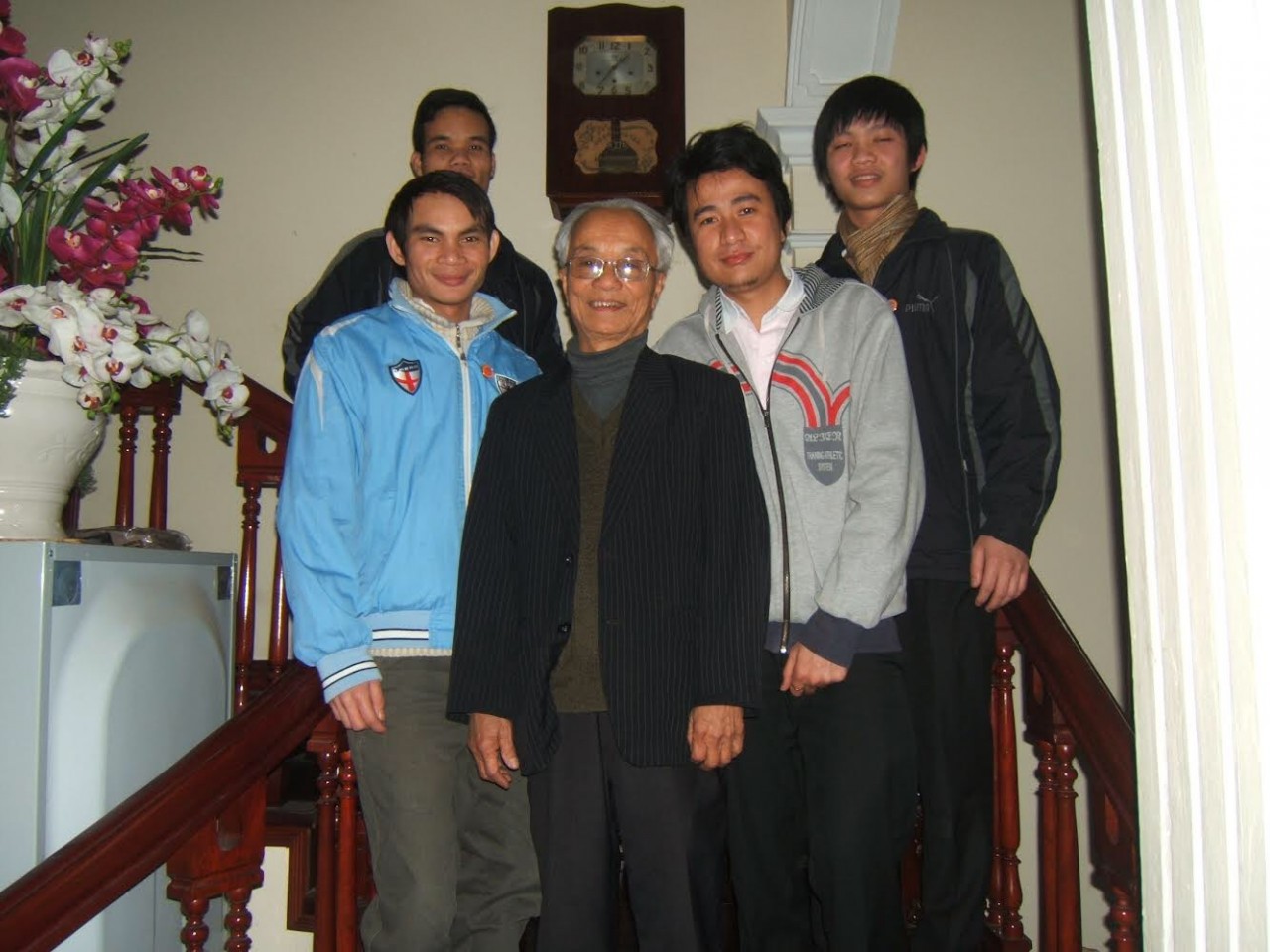 | Ông Vũ Vương Việt chụp ảnh bên bốn lưu học sinh Campuchia được ông đỡ đầu (Ảnh: NVCC). |