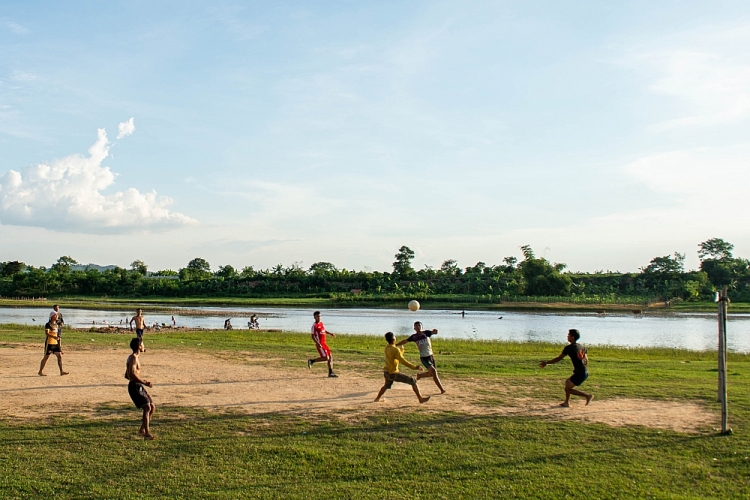 | Thanh niên làng Kon Drei đá bóng ở bến sông. Ảnh: ĐT |