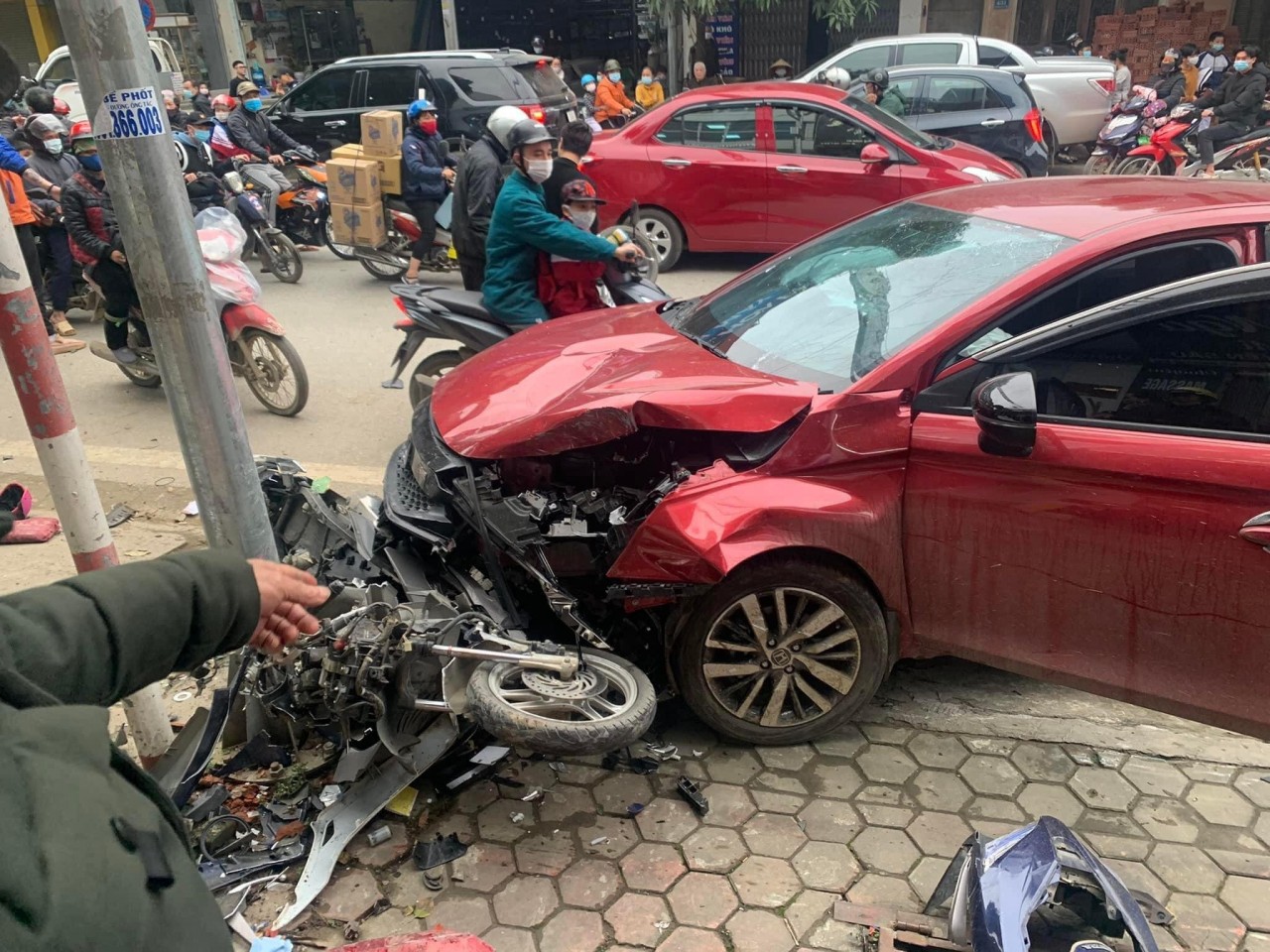 Hiện vụ việc đang được cơ quan chức năng làm rõ.Tại hiện trường phần đầu chiếc xe ô tô cùng nhiều xe máy bị hư hỏng nặng.