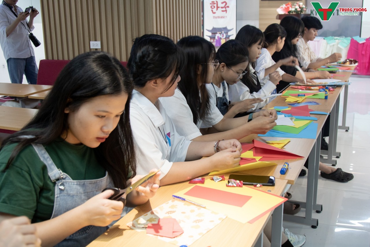 | Kết hợp trong quá trình tìm hiểu về Hanbok, học sinh được hướng dẫn nghệ thuật gấp giấy đặc trưng của người Hàn (jongi jeopgi). Đây là một nét văn hóa lâu đời được người Hàn gìn giữ, phát huy cho đến ngày nay. Nếu như Origami của Nhật Bản có cách gấp giấy cầu kì, mang hơi hướng nghệ thuật phức tạp thì cách gấp giấy của Hàn Quốc lại hướng đến sự đơn giản, dễ thực hiện phù hợp với cả người lớn và trẻ em (Ảnh: Trường Đại học Trưng Vương). |