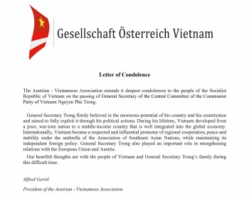 | "Chúng tôi xin gửi lời chia buồn chân thành nhất tới nhân dân Việt Nam và gia đình Tổng Bí thư Nguyễn Phú Trọng trong thời điểm khó khăn này", ông Alfred Gerstl, Chủ tịch Hội hữu nghị Áo - Việt Nam viết trong thư chia buồn gửi Liên hiệp các tổ chức hữu nghị Việt Nam trước sự ra đi của Tổng Bí thư Nguyễn Phú Trọng. |