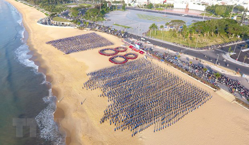 Các đoàn viên thanh niên thực hiện nghi thức chào cờ, xếp thành hình số 88 trên bãi biển, sau đó múa tập thể bài “Nối vòng tay lớn”, cùng hát vang bài hát “Thanh niên Việt Nam tiến bước”.